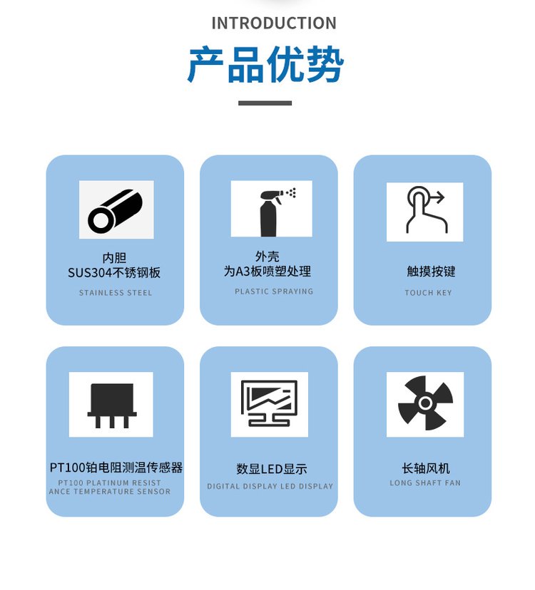 主要参数:1.温度范围:常温+10℃~250℃2.温度波动度:≤±1℃3.温度均匀度:≤±1℃4.温度精度:±1℃5.温度上升时间RT~100℃ 约15min6.温度解析度:±0.1℃7.加热形式:左右两侧加热管鼓风循环加热8.RKC智能控制表,定时范围1~999min二、箱体尺寸:内箱尺寸:H600*W500*D550mm外箱尺寸约:H1000*W800*D800mm三、设备配置: (1)电源:AC220V 50Hz 电压允许变动范围:额定值的±10%,可运行的最高值范围为±20%。(2)最大负荷容量:3.5 KW(3)最大电流: 50A四、箱体:外箱材料:1.2mm拉丝不锈钢板内胆材料:1.0mm优质镜面不锈钢板绝热材料:硬质聚胺脂发泡+高效特细保温玻璃棉 注:箱体内外不锈钢,单开门设计,控制器在箱体上平面位置